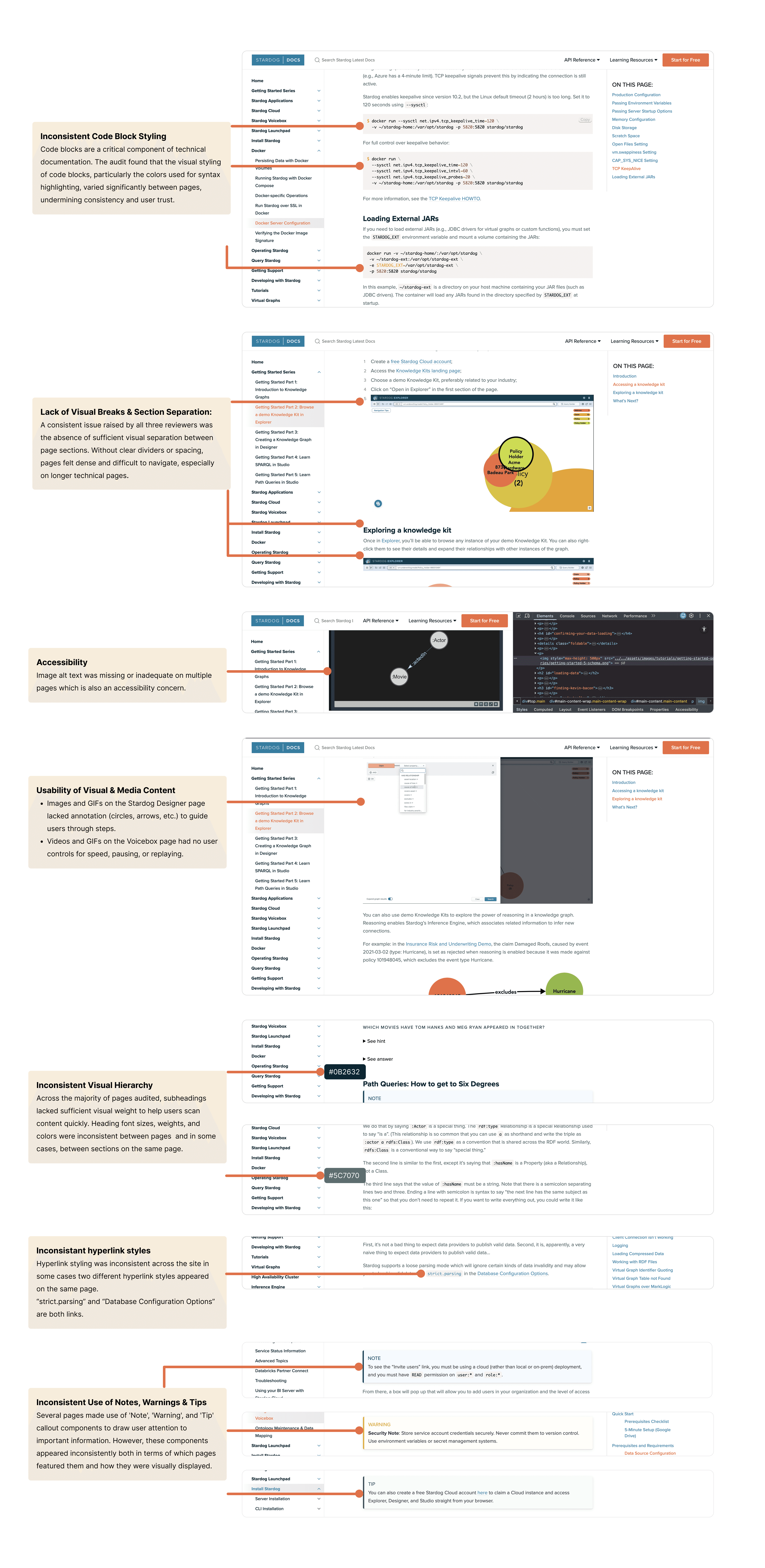 The content audit revealed systemic inconsistencies in visual structure, component usage, and accessibility across Stardog’s documentation. While the information itself is comprehensive, the lack of standardized design patterns, clear hierarchy, and consistent interaction cues increases cognitive load and reduces scannability.