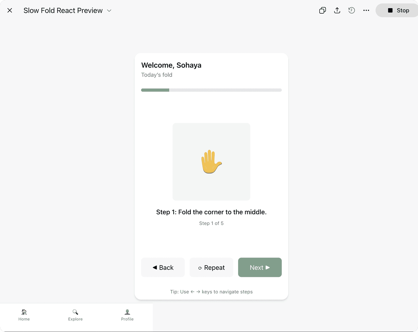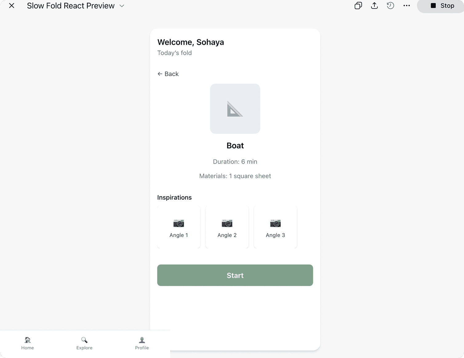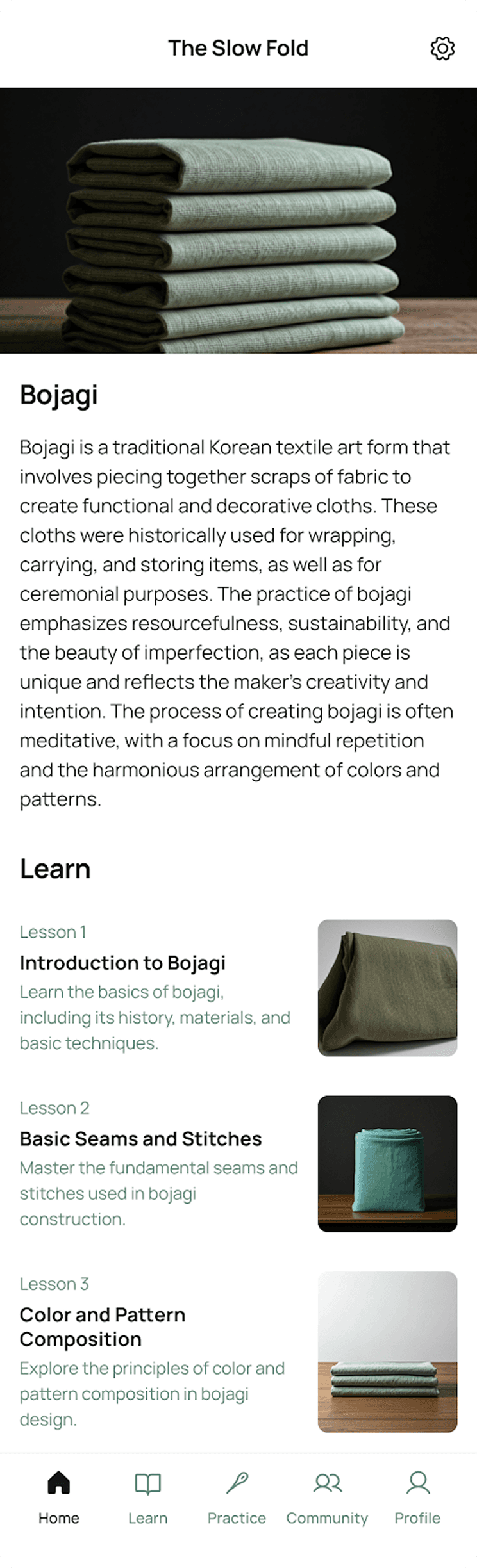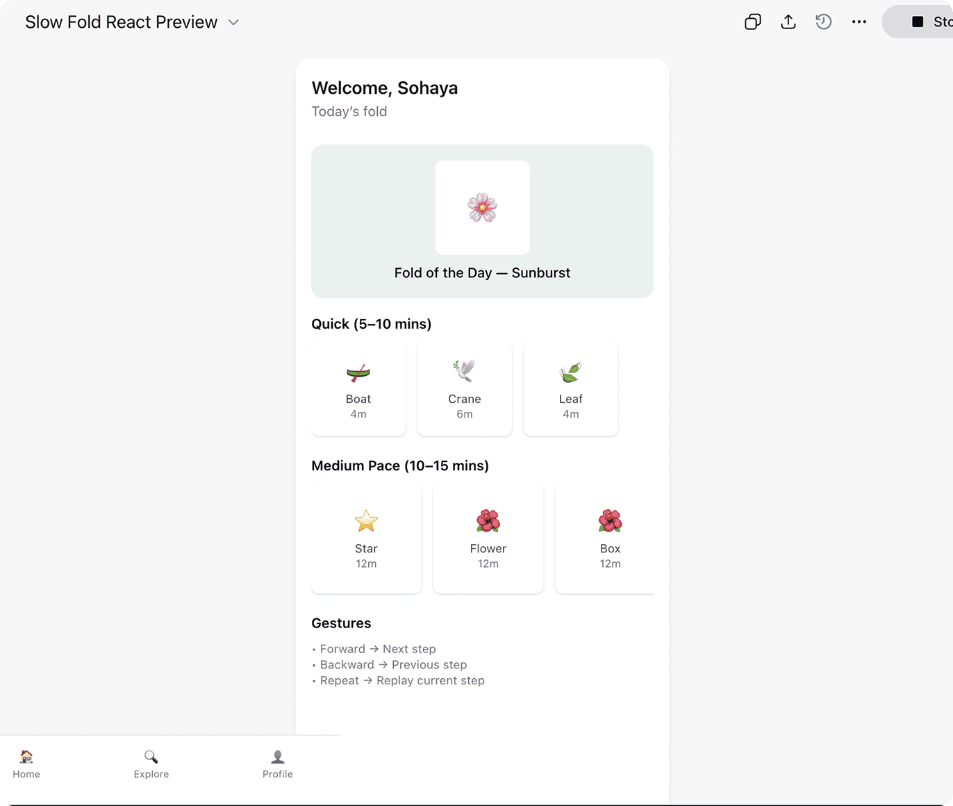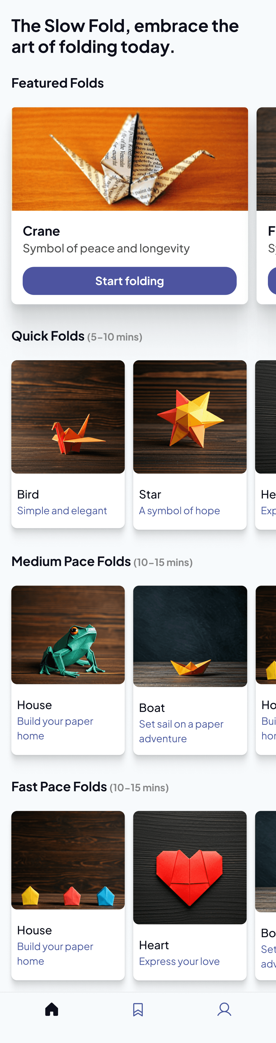 The Slow Fold is a mindful origami learning app designed to make creative practice simple and approachable. It breaks down origami folds into clear, structured steps and adapts to the time a user has available, supporting both quick moments of calm and deeper sessions of focused making.